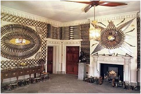 Culzean Castle stands on the brink of 150ft cliffs that drop sheer into the Firth of Clyde. In 1945 the widow of the 4th Marques agreed to hand the castle and grounds over to the National Trust for Scotland, subject to her retaining the use of the west wing for life, and subject to the top floor of the castle being converted into a flat for the use of General Eisenhower as a gesture of gratitude from Scotland, for his part in securing victory during World War II. The Eisenhower Apartment is a small, country house-style hotel, located on the second floor of Culzean Castle, enjoying superb panoramic marine views across the sea to the mountains of Arran...Comprising 6 bedrooms, a circular Drawing Room and elegant Dining Room, the Apartment is perhaps one of the most exclusive places to stay anywhere in Scotland. Dinner at the Eisenhower Apartment is served at 8pm, following drinks in the drawing room. The whole occasion is arranged on a very personal basis, with a selection of menus sent out to guests in advance of arrival. Any unsuitable dishes can be rejected and preferences suggested. Over afternoon tea the menu is presented for your final selection from two choices for each course. The emphasis is on fresh local produce such as home made vegetable soups, fresh garden salads, Ayrshire lamb, Scotch beef and the best of West Coast fish and seafood.At around 7.30pm the guests began to gather in the drawing room where a full cocktail bar - spirits, wine and champagne - was laid out for people to help themselves. The atmosphere was extremely `homely`- in a very grand and elegant fashion - and so much more comfortable and relaxing than a typical hotel. The armory display is the largest collection of its type in existence, apart from Her Majesty the Queen’s at Windsor Castle. In 1812, the flamboyant and ambitious 12th Earl bought the pistols and swords from the Office of Ordnance at the Tower of London. The arms were dispatched from London in twelve chests along with ‘one of the men from the tower with the Arms, who will fix them up in a proper manner’.